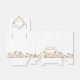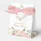 Un elegante ramo floral de peonías rosadas y rosas marfil enmarca la parte superior de esta encantadora caja de favores para el desayuno nupcial de primavera. Los ramitos de hojas de salvia decoran en medio de la variedad de flores melocotón que rodean la hermosa escritura dorada personalizada para una novia sonrojada en su fiesta del té.