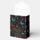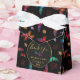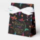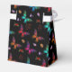 Pequeñas cajas de favores para un boda. Diseñado con un diseño elegante, con un ilustracion gráfico de mariposas revoloteadoras en muchos colores brillantes, que contrasta muy bien con el fondo negro. Flores, estribos y hojas caprichosas añaden un poco de encanto. Un marco negro con un borde de color dorado sobre la parte superior con tu texto personalizado dentro.