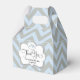Esta caja tiene un elefante azul madre y bebé en la parte superior de la etiqueta con un gran Gracias y la frase "por hacer este día tan especial" debajo. El fondo está impreso en forma de chevron azul y gris.