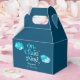 Caja de favores de la fiesta de cumpleaños 9 de un chico soñador con ilustracion de color azul. El texto de la tipografía dice "en la nube nueve" en fuente retro.