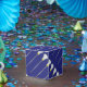 Noche de senior de lacrosse, evento de equipo o favores de fiesta de graduación para jugadoras de lacrosse con patrón de diseño de palo de lacrosse femenino sobre fondo azul. Edite el texto para personalizar.