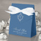 Una elegante caja de favores de primer comunión en azul y plata. En la solapa, tiene un escudo vintage con una cruz, ambos de Relieve metalizado falso de plata. El mensaje Gracias está escrito en la parte inferior, en un elegante guión falso de plata, la ocasión y la fecha están escritas en mayúsculas grises debajo. El fondo es azul clásico.