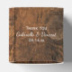 Personalice la encantadora Caja de Gorras y Favor de Bodas del País de Faux Barn Wood con los nombres de la novia y el novio y la fecha de la ceremonia matrimonial y llene con los favores de la fiesta o pequeños regalos para los invitados que asistan a su fiesta de compromiso informal pero elegante, ducha de novia o ceremonia matrimonial y recepción. Estas rústicas cajas de favores de madera de imitación de estilo personalizado de moda occidental presentan una pintoresca fotografía floral realzada digitalmente de un gorra de vaquero, ramo de girasoles amarillos, velo de novia blanco y pañuelo vintage de lino cortado con un fondo de madera de pino marrón templado.
