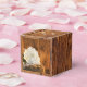 Personalizar la casual pero elegante Faux Barn Wood, White Hydrangea y Barn Wood Wedding Favor Box con los nombres personales de la novia y el novio y la fecha de la ceremonia matrimonial y llena con los favores de la fiesta o pequeños regalos para los invitados que asisten a su informal granja rural o a la recepción matrimonial estilo rancho. Estas cajas de favores de madera de imitación rústica, personalizado de moda de campo, presentan una pintoresca fotografía floral realzada digitalmente de una flor de horangea blanca y pañuelos de lino vintage sobre un balde de heno con fondo de granero marrón templado.