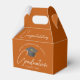 Estas cajas de favores del partido de graduación senior, naranja y personalizado, presentan su nombre de instituto o universidad para la clase de 2025. Personalizar con tu año de graduación bajo el elegante guión manuscrito y gorra gris grad para grandes favores de graduados personalizados.
