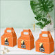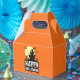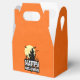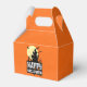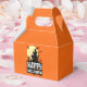 Feliz ilustracion de diseño de texto de Halloween con decoración de casa embrujada, cementerio y murciélagos en luna llena sobre fondo naranja de grano