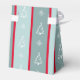 Feliz ilustracion navideño con árbol de Navidad y decoración estrella sobre fondo rayado rojo y azul