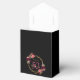 Elegante y glamuroso para una fiesta de cumpleaños número 50 (o cualquier edad). En la solapa delantera: letras de oro y el texto: Gracias. Delantera y trasera: fondo negro de moda con un marco geométrico falso dorado. Decorado con flores moradas oscuras y borgoñonas, rosas y plumas de estilo boho. El nombre está escrito con una escritura de estilo con letras a mano dorada. La fecha está escrita con números dorados y 50 años de edad en rosa.