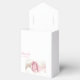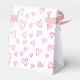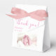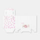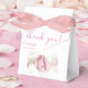 Una caja de favores para la fiesta de la ducha de bebé. Gracias por la tipografía de guiones elegantes. Personalice el nombre y la fecha. Colores rosados para una bebé, celebración fiesta de ducha de bebé. Un gran fiesta abastece a un recién nacido. Hay un patrón cardíaco en la parte posterior de la caja de favores.