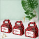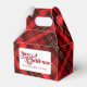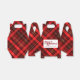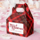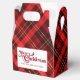 Un clásico tartán de felpa rojo detrás de tu mensaje de Feliz Navidad con tu apellido personalizado en esta caja de favores de fiesta de vacaciones. Cajas de favores tradicionales festivas con líneas rojas y doradas.