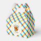 Placas de papel fiesta de verano con un tema floral de girasol, marco geométrico de oro y borde rojo, amarillo y azul de colores