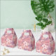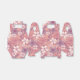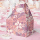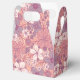 Esta caja de bienvenida está decorada con flores y hojas en tonos pastel de rosa y violeta sobre un fondo rosa.