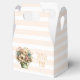 Una pequeña caja de favor con una imagen linda. Flores azules, rosadas y crema con hojas verdes. Puesto dentro de una maceta verde con un paño de cuadros verde colgando del lado.