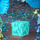 Moderno, florido adornado, árboles navideños en un gradiente sedoso: árboles en tonos turquesa/pavo real sobre un fondo pastel de agua