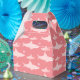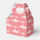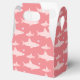 Caja de favores que muestra a una madre rosa y un tiburón bebé con un patrón repetido en un fondo rosado.