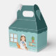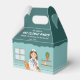 Celebrate a veterinarian themed birthday party with this cute favor box designed by Destei. The design features a fun cartoon illustration of a young girl veterinarian standing behind a gray examination table with an orange cat and a brown and white puppy, ready to care for her furry patients. She wears a white coat and nurse hat with a blue paw print, matching blue scrubs and a stethoscope around her neck. She has long brown hair and a happy expression.
