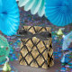 Eye-catching, fancy favor box pattern features Art Deco style geometric fans on black background
