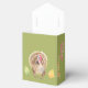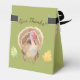 Adorable caja de Favor del Día de Acción de Gracias. Este diseño tiene un fondo verde claro, que se puede personalizar. El diseño frontal y posterior tiene un pavo marrón con hojas caídas verdes y amarillas. Sobre cada pavo están las palabras, "¡Den gracias!", que se pueden personalizar con un nombre o frase. En los lados hay ramas con más hojas de color otoño.