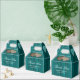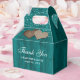 Rústico boda verde azulado agradecido caja de favores con luces de cuerda en un fondo de madera de granero.