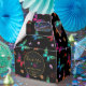 Moda y elegantes cajas de favores matrimoniales. Diseñado con un diseño elegante, con un ilustracion gráfico de mariposas revoloteadoras en muchos colores brillantes, que contrasta muy bien con el fondo negro. Flores, estribos y hojas caprichosas añaden un poco de encanto. Un marco redondo negro con un borde de color dorado sobre la parte superior con tu texto personalizado dentro.