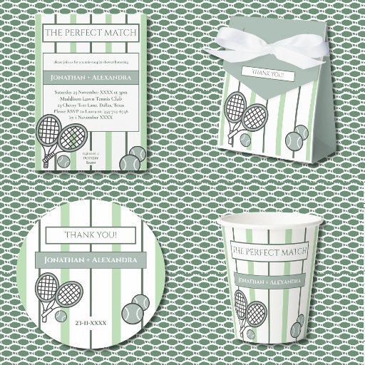 Celebrate love and a winning partnership with these personalized, The Perfect Match Couples Bridal Shower favor gift boxes. This elegant and modern design features tendy tennis rackets paired with playful tennis balls in soft tones of green and white. All elements are beautifully set against a chic mint, sage green and white stripes background, creating a look that is both fresh and timeless. Perfect for couples who share a love for a friendly tennis match, these favor gift boxes are fun yet refined—ideal for a match made in heaven. The modern typography font adds a contemporary touch, while the overall aesthetic remains stylish and celebratory. Each thank you favor gift box is finished with an elegant white bow, making it a thoughtful keepsake your guests will truly appreciate. Perfect for a couples bridal shower, this design blends sporty charm with classic elegance for a memorable celebration.