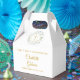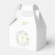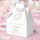 Elegante caja de favor para primera comunión floral que presenta una guirnalda de vegetación de laurel y cruz dorada con los detalles de su evento en tipografía dorada chic. Puede personalizar con su propio mensaje de agradecimiento en el reverso. ¡Una forma perfecta de decir gracias a sus invitados! Diseñado por Thisisnotme©