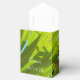 Piensa verde con verduras frescas. Las hojas verdes largas, en la fotografía original de MaeFlowers en esta tienda de campaña Favor Box, son hojas de palmera soplando en la brisa. La luz del sol resalta algunas de ellas, convirtiéndolas en un color verde amarillo claro. Otros están más oscuros, mientras se curvan de la rama del árbol, arrojando sombras verde lima sobre las hojas en el sol. Entre las hojas se pueden ver bits de cielo azul tropical. Hay un texto que está configurado para personalizar, o eliminar si lo prefiere.