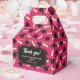 Graduation favor boxes printed with a pink pattern of graduation caps and diplomas with a yellow ribbon. Customize the graduation themed favor boxes with the name of the graduate or the name of the celebration, and with the date.
