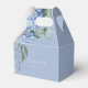 Caja de regalo de hydrangea azul elegante y chic, con un hermoso diseño floral, junto con sus nombres, fecha del evento y texto de 'gracias'. Personalizable según sus preferencias.