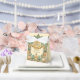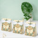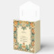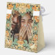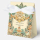 Intricate, highly detailed vintage botanical motif party favor box with Inca and Aztec influences; greens and orange with gold; space for lovely couple picture