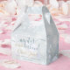 Cajas de favores para el primer cumpleaños de invierno ONEderland con tipografía elegante y copos de nieve delicados sobre un fondo de escarcha invernal. Diseñadas por Thisisnotme©