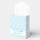 El diseño presenta un fondo polka-punto azul y blanco. La imagen de una nube de lluvia azul "Showering" se muestra en la apertura. El nombre del bebé junto con la fecha de vencimiento se muestra en azul a través de un respaldo blanco entre los bordes azules. Perfecto para una ducha de bebé para un niño.