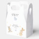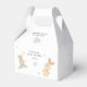Un niño pequeño está en camino de los niños caja de favores para la ducha de bebé con adorables osos de peluche, estrellas, media luna, cojines de corazón de amor pastel y fondo de color ruidoso. Añada fácilmente sus detalles haciendo clic en el botón "Personalizar" situado arriba