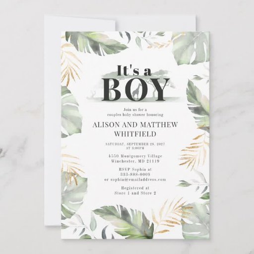 Postal de Invitación de Baby Shower de Jungle Safari Boy Giraffe. Wild, calmada y elegante boy safari animal invitación a la ducha de bebé con una jirafa, efecto oro y hojas verdes. Perfecto para las invitaciones a la ducha de bebé.