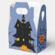 Una divertida caja de favores con un tema de Halloween. El color de fondo es un gris-azul chillón. En la parte delantera y trasera de la caja, hay una silueta de una casa con calabazas. A los lados de la caja hay una araña con una etiqueta que dice "TRICK OR TREAT". Este texto se puede personalizar.