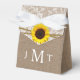 Celebre con estilo con estas elegantes y muy modernas cajas de favores de boda. El diseño cuenta con un girasol rústico con burlap, encaje y gemelos, que es perfecto para cualquier celebración de matrimonio con temática de campo o granero. El diseño es fácil de personalizar con sus propias iniciales de monograma y su familia y amigos estarán encantados cuando reciban estas fabulosas cajas de favores. Se pueden encontrar elementos coincidentes en la colección.