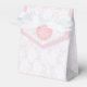 Elegante caja de regalo de bienvenida con ducha de novia, de un aspecto de encaje rosa pálido y blanco, con la parte delantera cubierta de rosa pálido. Los gráficos de un disco de borde rosado en la solapa tienen texto personalizado blanco listo para personalizar. Pequeña y encantadora caja de regalo para caramelos y cualquier otra cosa que quieras regalar a tus invitados.