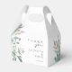 Una elegante caja de bufés de bodas con elegantes ilustraciones de hojas botánicas en tonos verde, beige y dorado. El guión moderno "Gracias" añade un toque de sentidos, mientras que sus nombres y fecha personalizan el diseño. Perfecto para elegantes bodas de inspiración natural o celebraciones al aire libre.