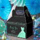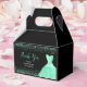 A beautiful light green themed elegant watercolor dress gown on a black background with faux glitter at the top and bottom of the favor box.