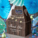 Caja de agradecimiento de boda de madera rústica con luces de cuerda sobre un fondo de madera de granero.