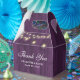 Caja de agradecimiento de boda rústica morada con luces de cuerda sobre un fondo de madera de granero.