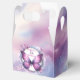 Bonitas cajas de favores de cumpleaños con una mariposa radiante, rodeadas de un aura celeste y delicados acentos florales. La mariposa, pintada en tonos púrpura y rosa, simboliza la transformación y los nuevos comienzos, convirtiéndola en el emblema perfecto para conmemorar otro hermoso año de vida.