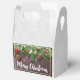 Pequeña caja de favores con una fotografía rústica de una mesa de madera marrón con pinecones, agujas de pino, nieve y adornos navideños. Festiva y encantadora.