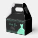 A beautiful light green themed elegant watercolor dress gown on a black background with faux glitter at the top and bottom of the favor box.