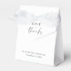 Una caja de favores matrimoniales minimalistas de moda con "Amor + Gracias" en un guión moderno y elegante tipografía serif, sus nombres y fecha de boda.