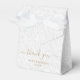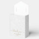Elegante patrón de impresión de color blanco sobre fibra blanca con sus nombres y gracias en letras de oro de moda en la parte delantera, estas cajas de favores de la fiesta estilo tienda de cierre de cinta son hermosas para favores de boda, favores de ducha de novia o cualquier ocasión especial.