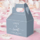 Moda polvorienta caja de favores de boda azul con "amor es dulce" en una simple tipografía blanca y un elegante guión de caligrafía blanca con toques, tus primeros nombres unidos por un corazón y tu fecha boda.