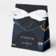 Este moderno diseño presenta una forma de arco azul oscuro sobre un fondo de acuarela azul marino adornada con un purpurina de imitación dorado. Personalízalo con los nombres de la novia y el novio y los detalles del boda en blanco.