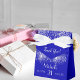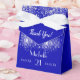 Una elegante y glamorosa caja de favores azul y blanco 21 (o cualquier edad) de cumpleaños. Fondo de color azul real con polvo falso purpurina plateado. Con el texto: ¡Gracias! Plantillas para un nombre, fecha de nacimiento y fecha de aniversario y número de edad. Letras blancas.