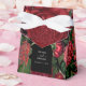 Un bonito diseño con flores oscuras de color rojo burdeos sobre un fondo negro y un arco negro. Perfecto para los amantes de los diseños de flores originales y de los tonos oscuros. Un elegante diseño floral de color negro y rojo marrón. Un diseño de caja de favores de flor silvestre y rosas con elementos modernos. También hay disponibles invitaciones de boda coincidentes y otros artículos de papelería.